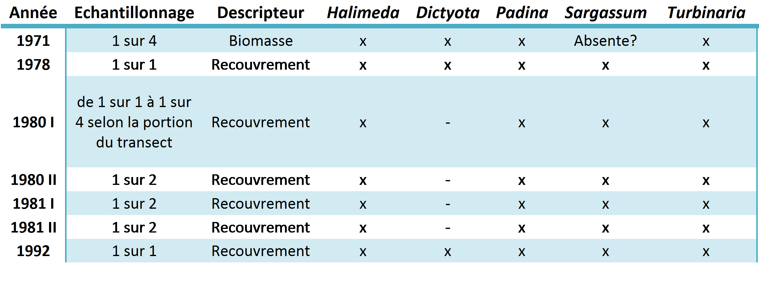 Sampling strategy for macro algae on the radiale of Tiahura since 1971 (x: sampled genus; -: genus present but not sampled; Absente?: unsure of presence in 1971). The frequency of the sampling is in accordance to the sampling units on the radiale