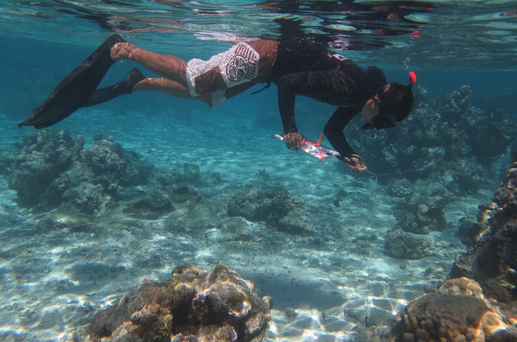 On the barrier reef, the fish census is completed by making 2 passes on the same quadrat. On the first pass, every 10m (including the beginning of the transect), a stop is made to count the fleeing species (scaridae, labridae,...). Then while swimming slowly the sedentary and cryptic species are counted (serranidae, pomacentridae, holocentridae,...), except the six-bar wrasse ("Thalassoma hardwicke") and the striated surgeofish ("Ctenochaetus striatus"). On the second pass, these two species are then counted while swimming swiftly back