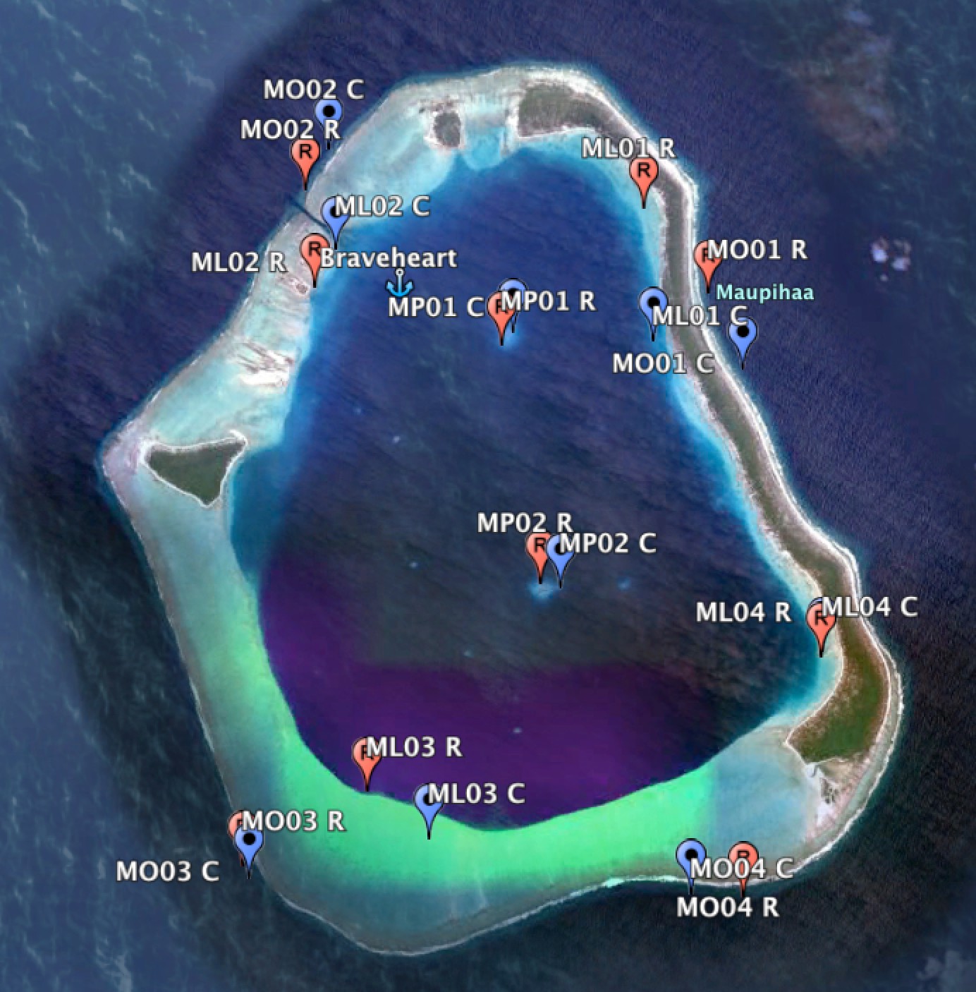 Satellite image of Mopelia with stations marked in red for experimental fishing and underwater visual census in blue